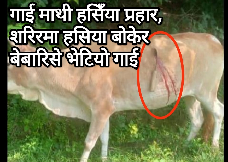 गाईलाई हँसिया प्रहार भएको छ । लमही नगरपालिका वडा नम्बर ८ बिच्का गाउँमा घाईते गाई फेला परेको हो ।