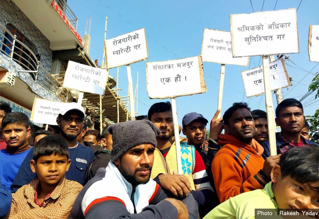 उनीहरुले रोजगारीको ग्यारेन्टी गर, श्रमिकको अधिकार सुनिश्चित गर, बन्द उद्योग खुला गर लगायतका नारा लेखिएका प्लेकार्ड बोकेका थिए ।