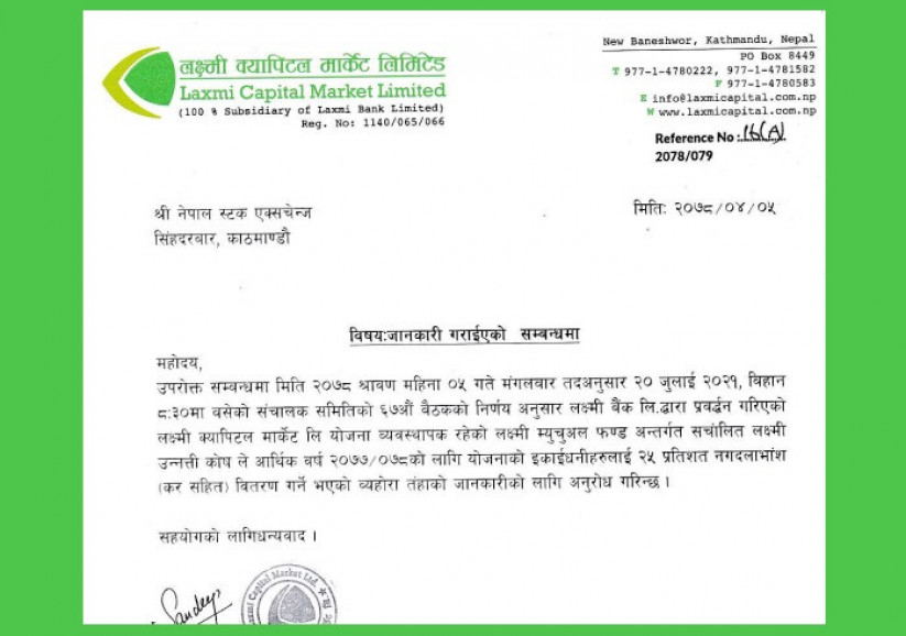 लक्ष्मी म्युचुअल फण्ड अन्तर्गत सञ्चालित लक्ष्मी उन्नती कोषले गत आर्थिक वर्षको मुनाफाबाट इकाईधनीहरुलाई लाभांश वितरण गर्ने घोषणा गरेको छ। कोषले आर्थिक वर्ष २०७७/७८ को लागि २५ प्रतिशत नगद लाभांश वितरण गर्ने घोषणा गरेको हो। साउन ५ गते सम्पन्न सञ्चालक समितिको बैठकले सो दरमा नगद लाभांश वितरण गर्ने घोषणा गरेको हो।