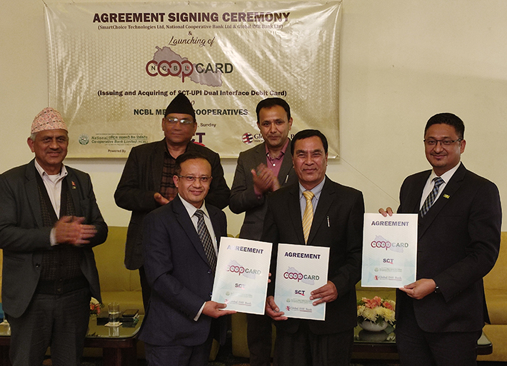 ग्लोबल आइएमई बैंक, राष्ट्रिय सहकारी बैंक र स्मार्ट च्वाइस टेक्नोलोजिजबीच त्रिपक्षीय सम्झौता भएको छ । ‘सहकारीहरुका लागि सहकारी’ पहिचान सहितका ‘कोप कार्ड’ जारी गर्नेसम्बन्धमा उक्त सम्झौता गरिएको हो ।