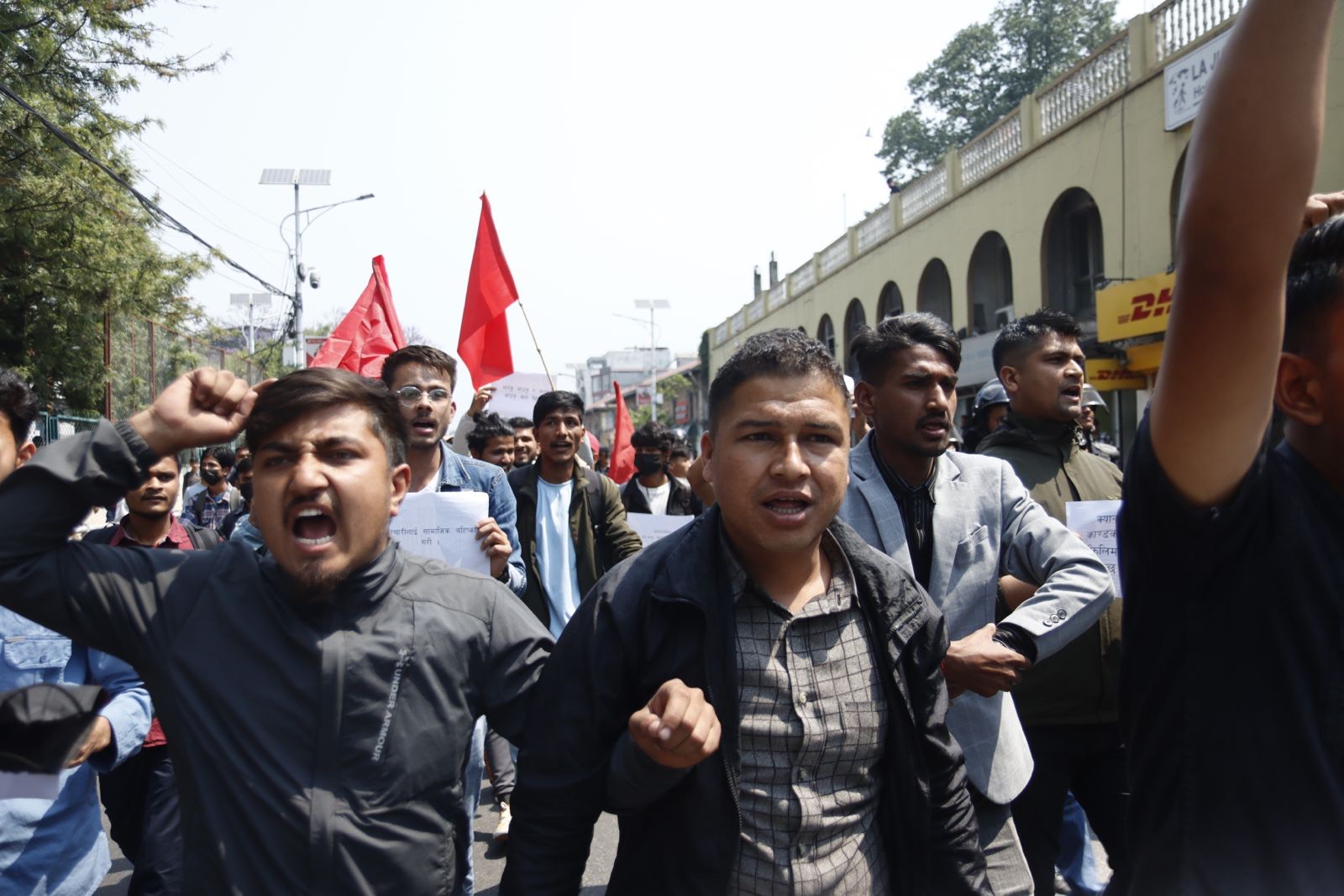 नक्कली शरणार्थी बनाई नेपाली नागरिक बेच्नेलाई कारबाही गर भन्दै विधार्थीहरू आन्दाेलनमा