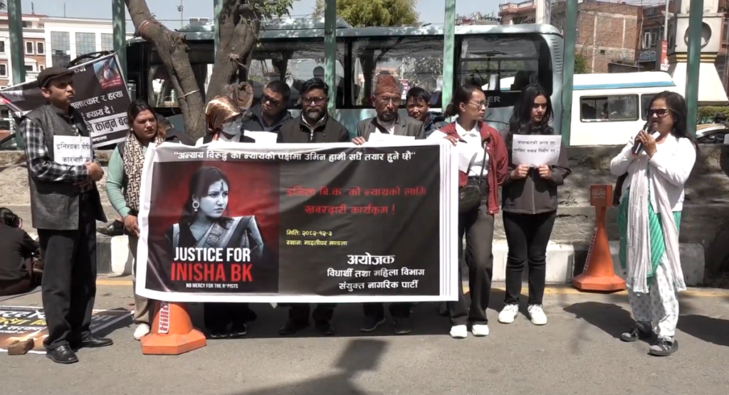इनिशा बिकको न्यायलका लागि भन्दै संयुक्त नागरिक पार्टी विद्यार्थी तथा महिला विभागले मंगलबार माइतीघरमा खबरदारीसहित प्रदर्शन गरेको हो। प्रदर्शनमा सहभागीहरुले इनिशाको हत्यारालाई कारबाही गर, बलात्कारको अन्त्य गर, सुरक्षित समाज निर्माण गर लगायतका नारा लेखिएका प्लेकार्ड प्रदर्शन गरेका थिए।