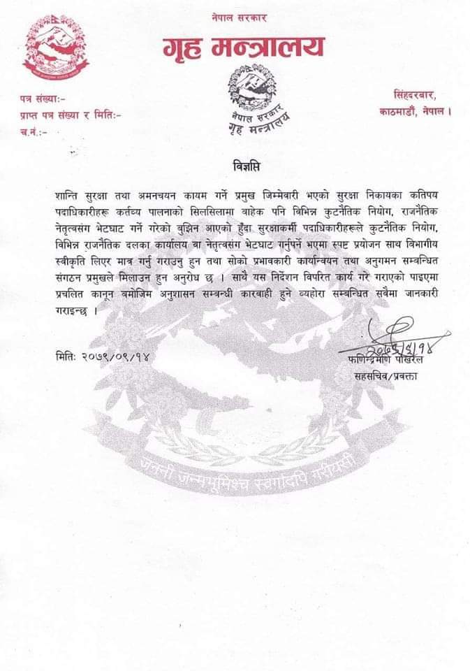 प्रयोजन नखुलाई विभागीय स्वीकृति नलिई आफूखुसी नेता र राजदूत नभेट्न सुरक्षा अधिकारीहरुलाई गृह मन्त्रालयले निर्देशन दिएको छ ।
