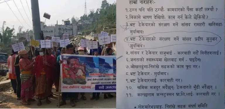 साथै, ठेकेदारलाई ओखलढुंगाकै सांसद रामहरी खतिवडाको संरक्षण रहेको स्थानीयको आरोप छ । तर, खतिवडाले भने स्थानीयको विरोध प्रदर्शनमा आफ्नो पूर्ण समर्थन रहेको बताएका छन् । ‘जनताको ज्यानको सुरक्षा गर ठेकेदारलाई छिटो कारवाही गर’ भनी खतिवडाले सामाजिक सञ्जालमा लेखेका छन् ।