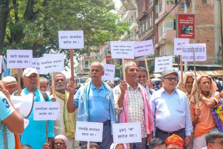 उनीहरुले लेनदेन कारोबार सहज गर, सामाजिक सद्भाव कायम राख, प्रहरी दमन बन्द गर, २०८० को अध्यादेश खारेज गर जस्ता नारा लेखिएको प्लेकार्डसहित बोकेर प्रदर्शन गरिरहेका छन् ।