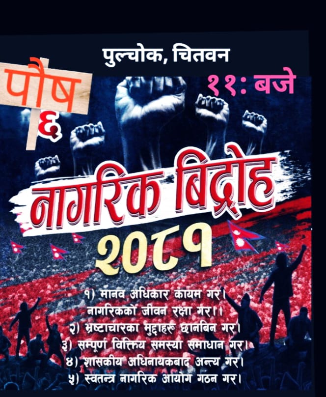 सर्वसाधारण, नागरिक समाजका अगुवा, स्वतन्त्र अभियन्ता, र न्यायका पक्षमा उभिने सबैलाई चितवनकाे आयोजना हुने कार्यक्रममा उपस्थित भई नागरिक विद्रोहलाई सशक्त बनाउन हार्दिक अनुरोध गरिएको छ। साथै आयोजकले चितवनमा यहि आउँदो पौष ६ गते पुल्चोक मा कार्यक्रम हुने जानकारी गराएका छन् ।