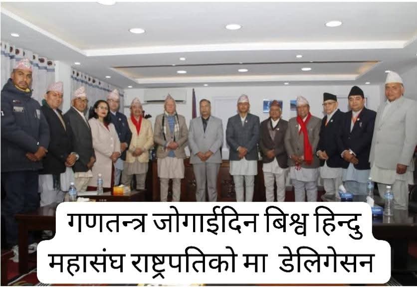 काठमाण्डौ। नेपालमा हिन्दू राष्ट्र पुनर्स्थापना गरि विश्वमा रहेको पहिचान कायम गर्न संबिधान संसोधन अबिलम्ब गर्नुपर्ने माग राख्दै विश्व हिन्दु महासंघ नेपालका पदाधिकारी राष्ट्रपति तथा उपराष्ट्रपति समक्ष पुगेका छन्। केहि दिन अघि आफैंहरुले फेसबुकमा पोस्ट राख्दै उक्त कुरा उल्लेख गरिएको थियो। तर खेदजनक कुरा चाहिं , राजालाई हिन्दु धर्ममा हिन्दु सम्राट मानिन्छ तर विश्व हिन्दु महासंघका पदाधिकारीको माग भने हिन्दुराष्ट्र मात्र हो त्यो पनि राजा बाहेकको।